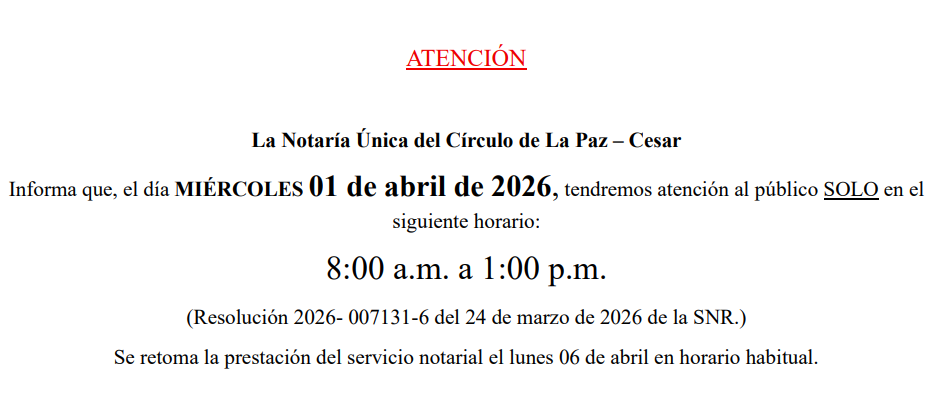 Por medio de la cual se establece un horario especial para el día 1 de abril de 2026 y se autoriza la suspensión de términos y la prestación del servicio público notarial a los despachos notariales del país los días 4 y 5 de abril de 2026, y a la vez se fija una fecha...